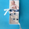 Cegonha em poliresina com efeito cerâmico, chapéu azul e saco de bebé com a palavra “Baby”. Ideal para bolos e decoração de batizado ou chá de bebé.