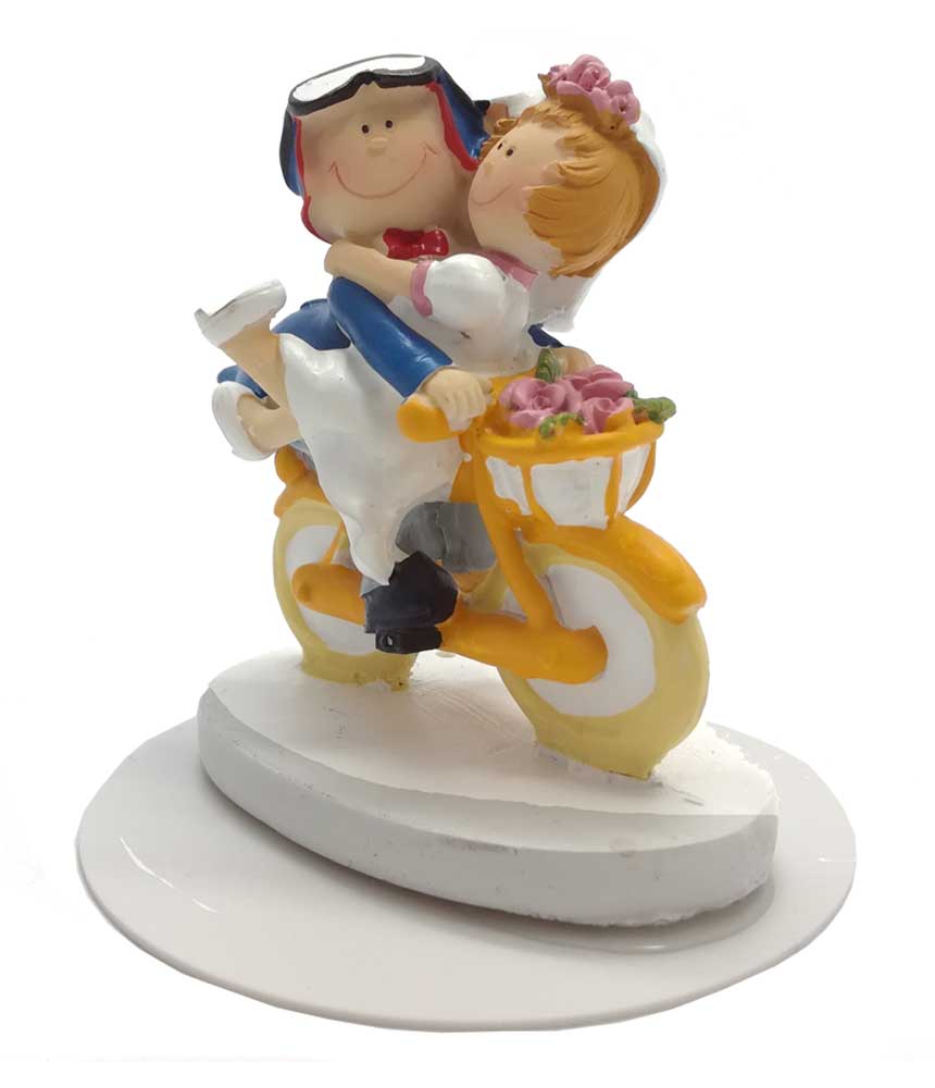 Esta encantadora figura em cerâmica retrata um casal de noivos sentado numa bicicleta amarela. A noiva, feliz no colo do noivo, completa a cena com um delicado bouquet no cesto da bicicleta.