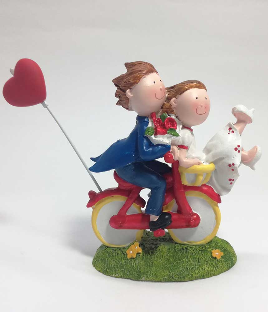 Esta encantadora figura em poliresina mostra um casal de noivos num passeio romântico de bicicleta. O noivo pedala com um sorriso, enquanto a noiva se diverte sentada no cesto da bicicleta vermelha. Um balão em forma de coração, preso por um delicado arame, acompanha o casal, criando uma cena leve e apaixonante.
